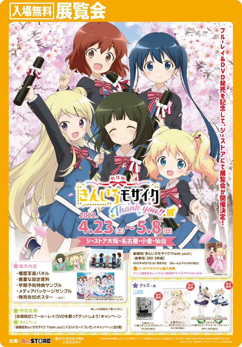 「劇場版きんいろモザイク Thank you!!」ブルーレイ&DVD発売を記念して、ジーストア大阪、名古屋、小倉、仙台にて展覧会が開催決定!
