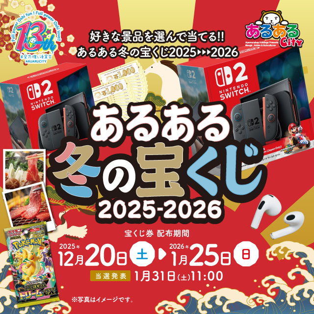 期間中、あるあるCity館内でのお買い物額2,000円(税込・レシート合算不可)毎に豪華賞品が当たるスクラッチカード1枚プレゼント