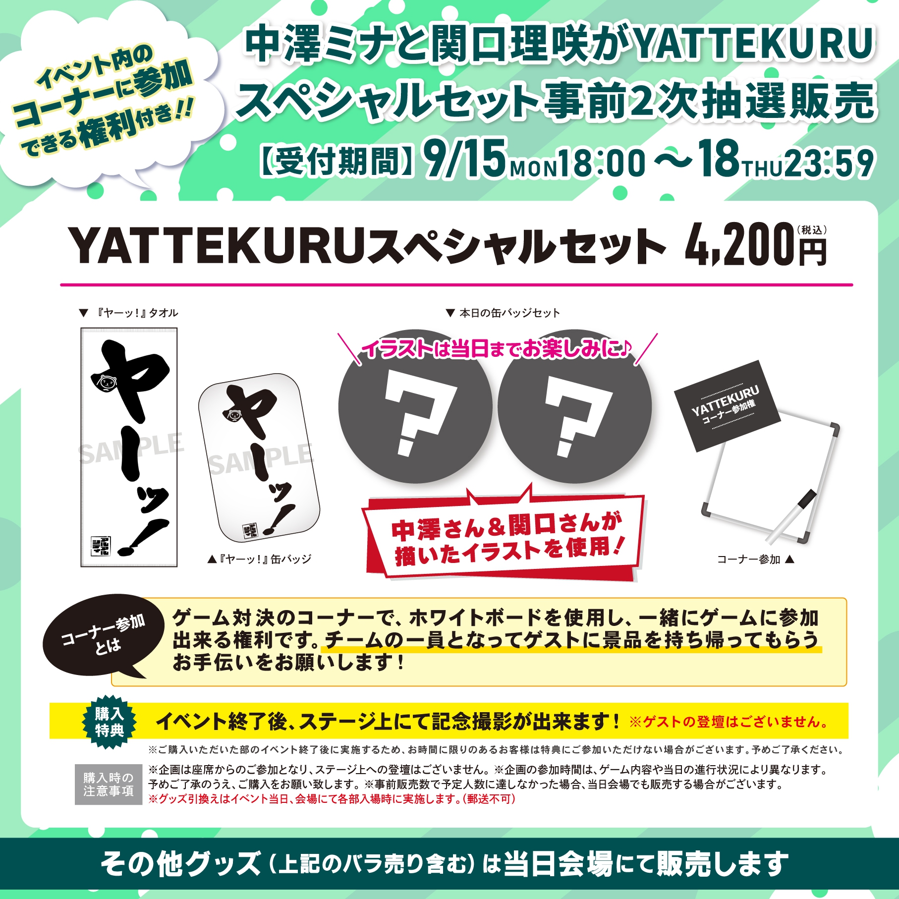 イベント内のコーナーに参加できる権利が付いた「YATTEKURUスペシャルセット」の2次抽選販売を実施します!