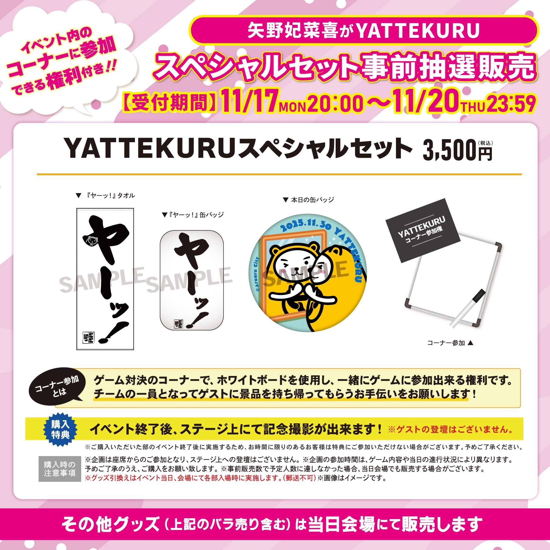 イベント内のコーナーに参加できる権利が付いた「YATTEKURUスペシャルセット」を事前抽選販売致します!