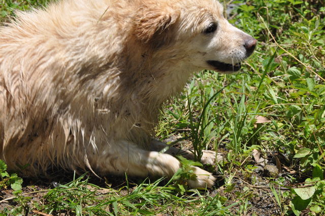 さんぽ中に小川にダイブして土の上でゴロゴロした結果どろんこに。