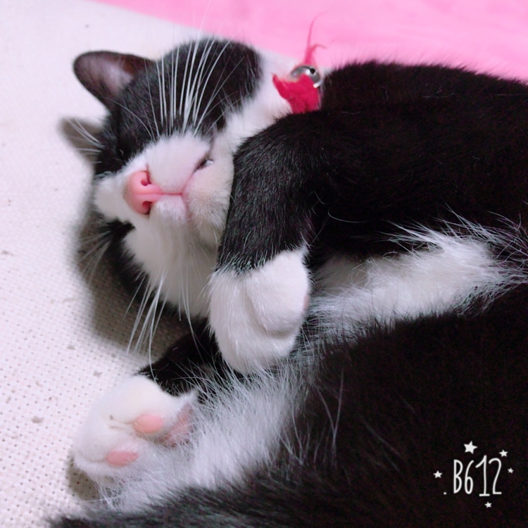 気持ちよく寝てるところを撮りました! 飼い犬の寝床を占領してます 可愛いピンクの肉球とちらっと見える歯がポイントです!