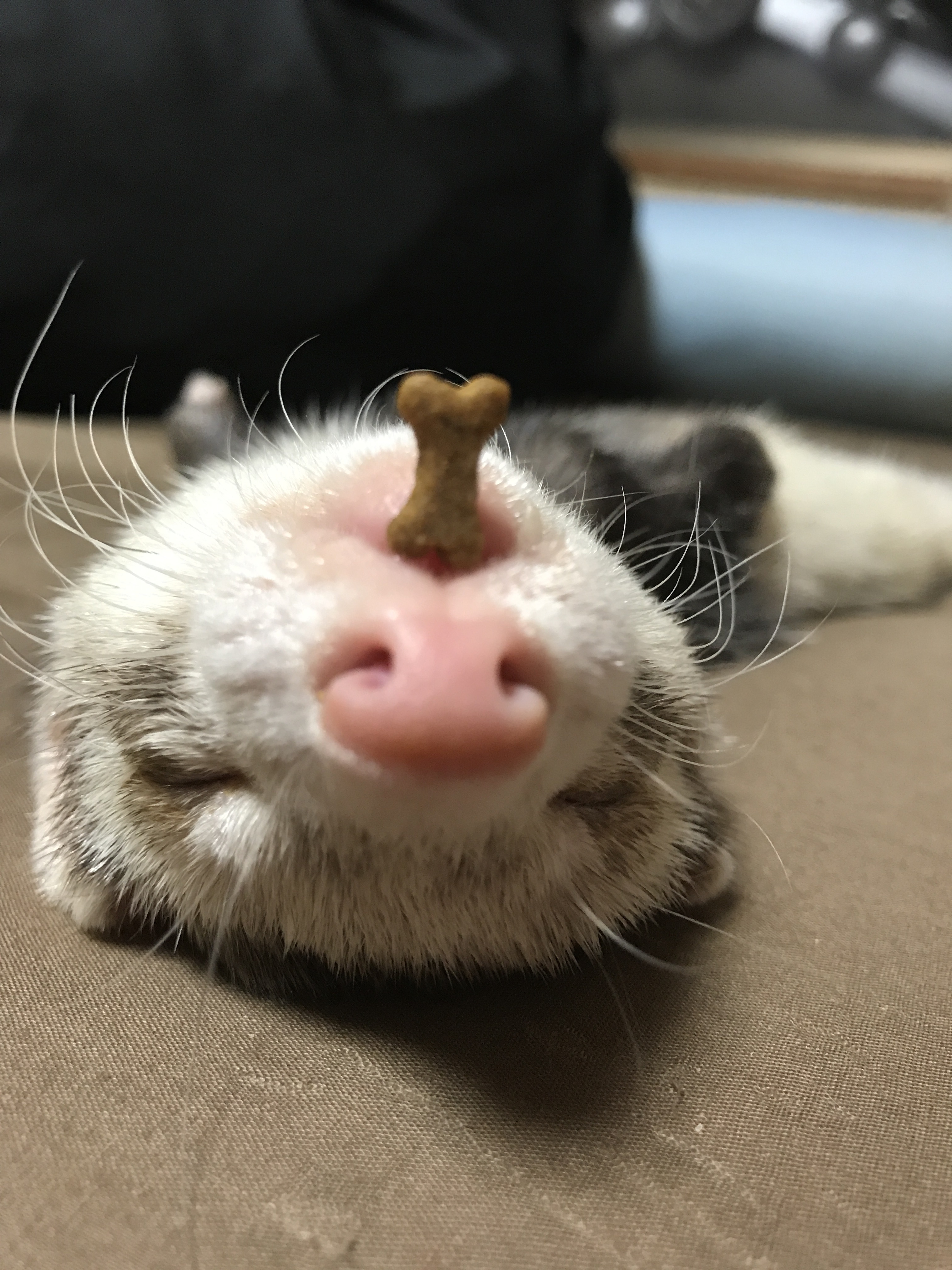 口にエサを置いても起きないレオ君。 爆睡して中々起きないフェレット。 早く起きないと他の子にごはん食べられちゃうよ〜